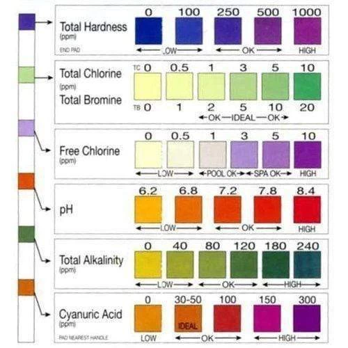 Tests for: Total Hardness, Total Chlorine, Total Bromine, Free Chlorine, pH, Total Alkalinity, and Stabilizer (Cyanuric Acid)